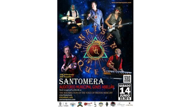 Santomera acogerá este sábado, 14 de junio, el concierto 'Unrisen Queen', banda considerada a nivel internacional como la resurrección de la voz de Freddie Mercury. La actuación comenzará a las 22:30 horas en el Auditorio Municipal Ginés Abellán y servirá como punto de partida de su nueva gira, titulada '15 years in a live-time', con la que el grupo celebra sus quince años sobre los escenarios.